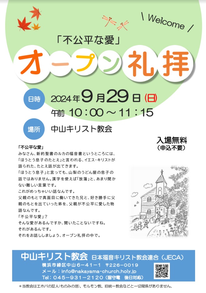 2024年9月オープン礼拝のお知らせ2024年9月3日2024年9月4日 集会・イベント案内2024年, JECA, オープン礼拝, キリスト教, 中山教会Posted by nakayama-church